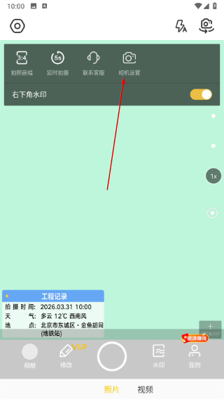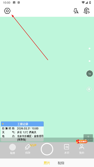 1、打開修改水印相機,點擊頁面左上角設(shè)置圖標(biāo)。